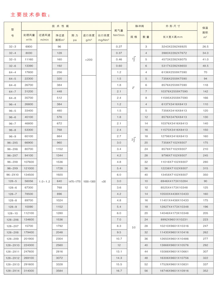 外濾式,采用大口徑脈沖閥,高壓、小氣量脈沖清灰清灰強度高,需壓縮空氣(0.5一0.7Mpa)。
